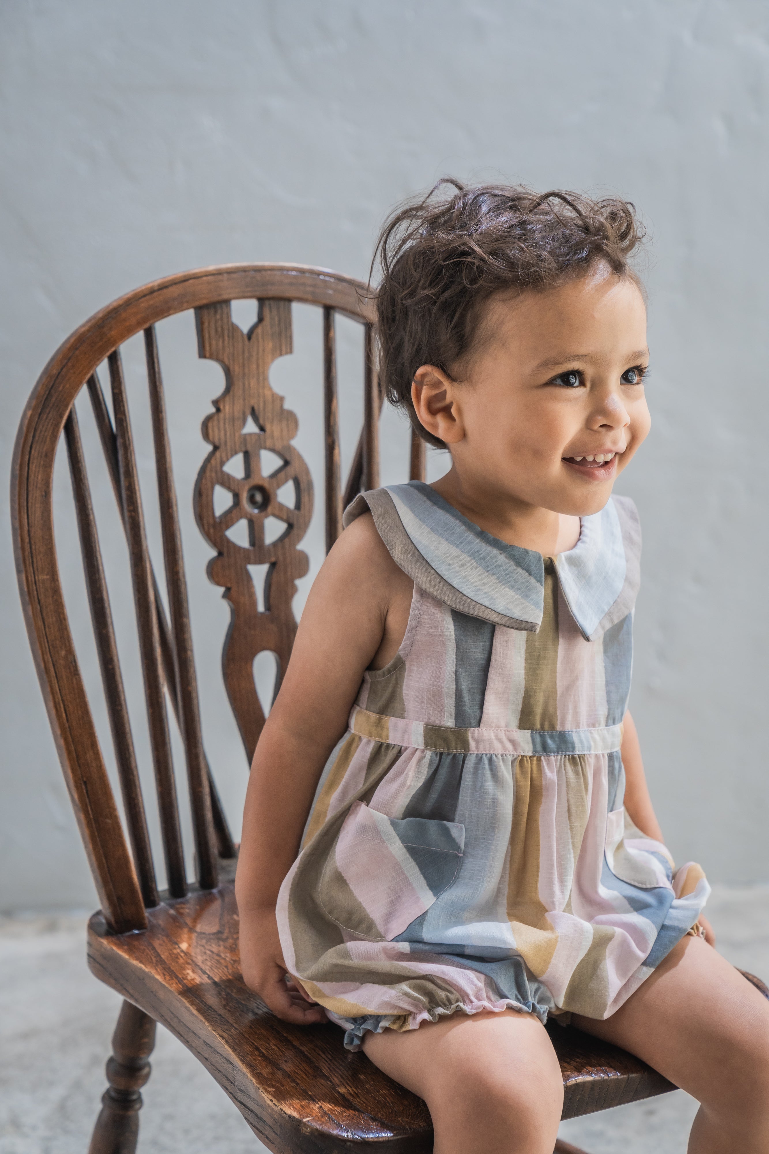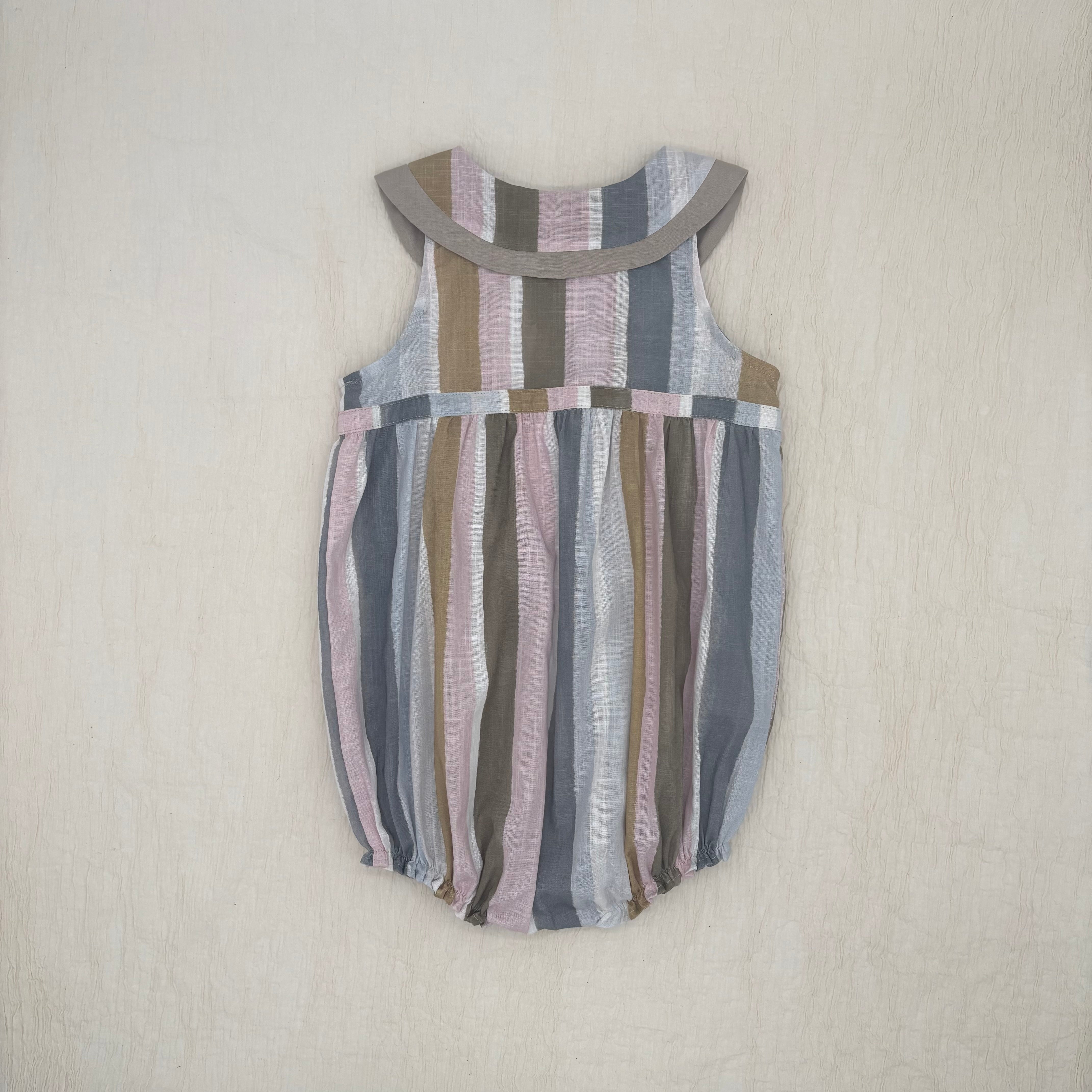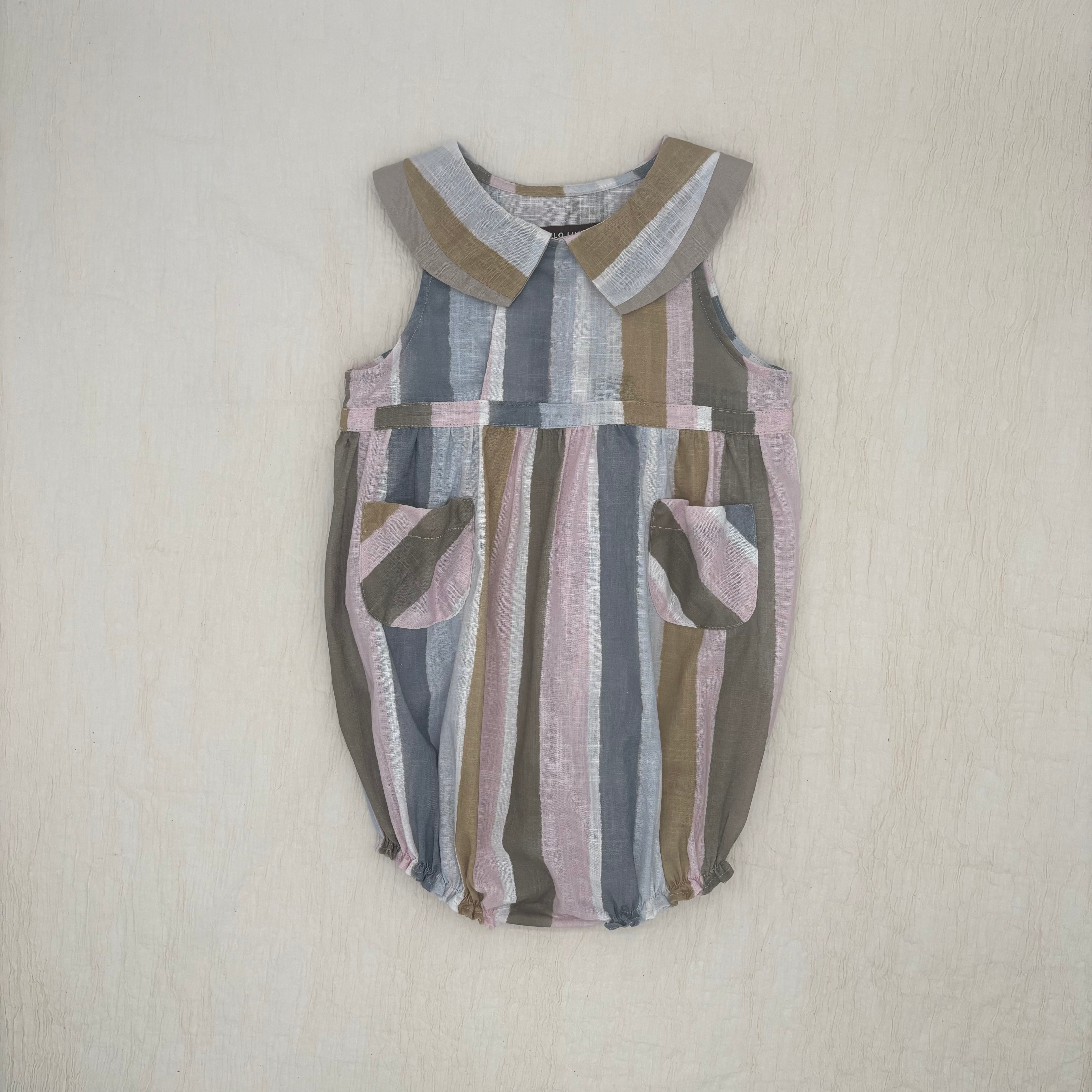 The Oliver Baby Jumpsuit is a sleeveless style with a unique curved contrast trim, inspired by our Marlo top. It features a side front button opening, snap buttons for easy nappy changes, and elasticated leg openings for comfort. Finished with two patch pockets.