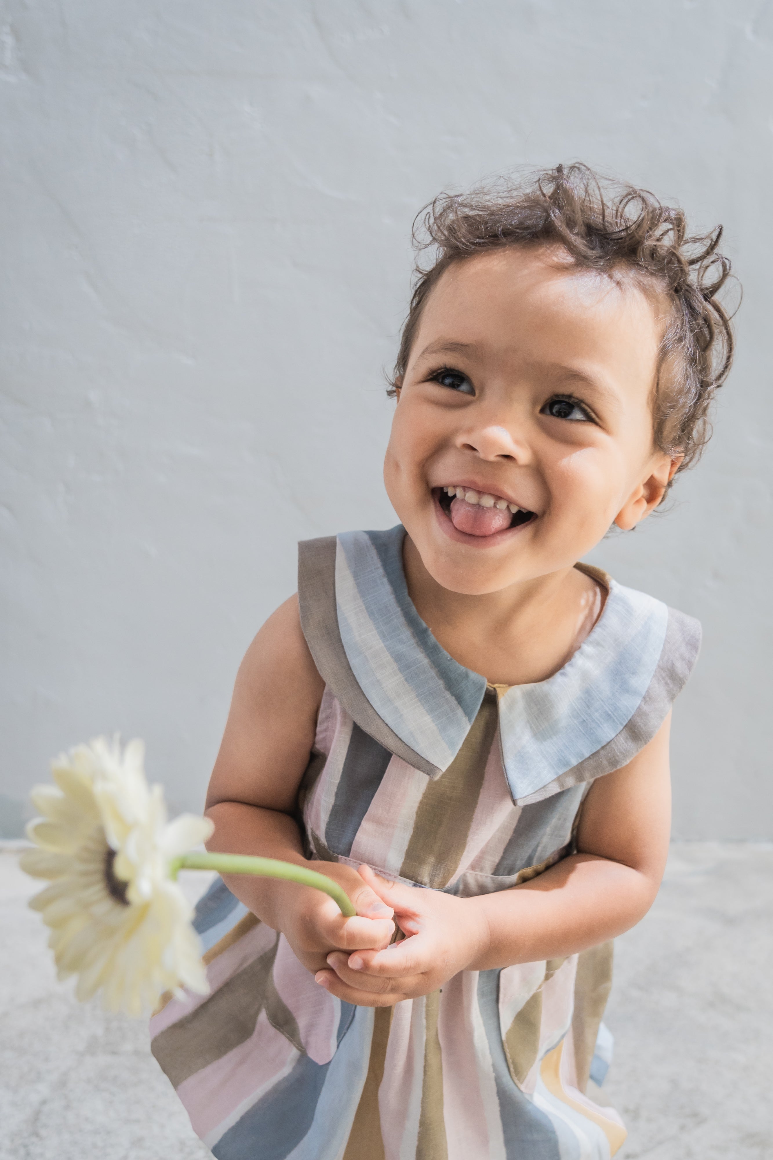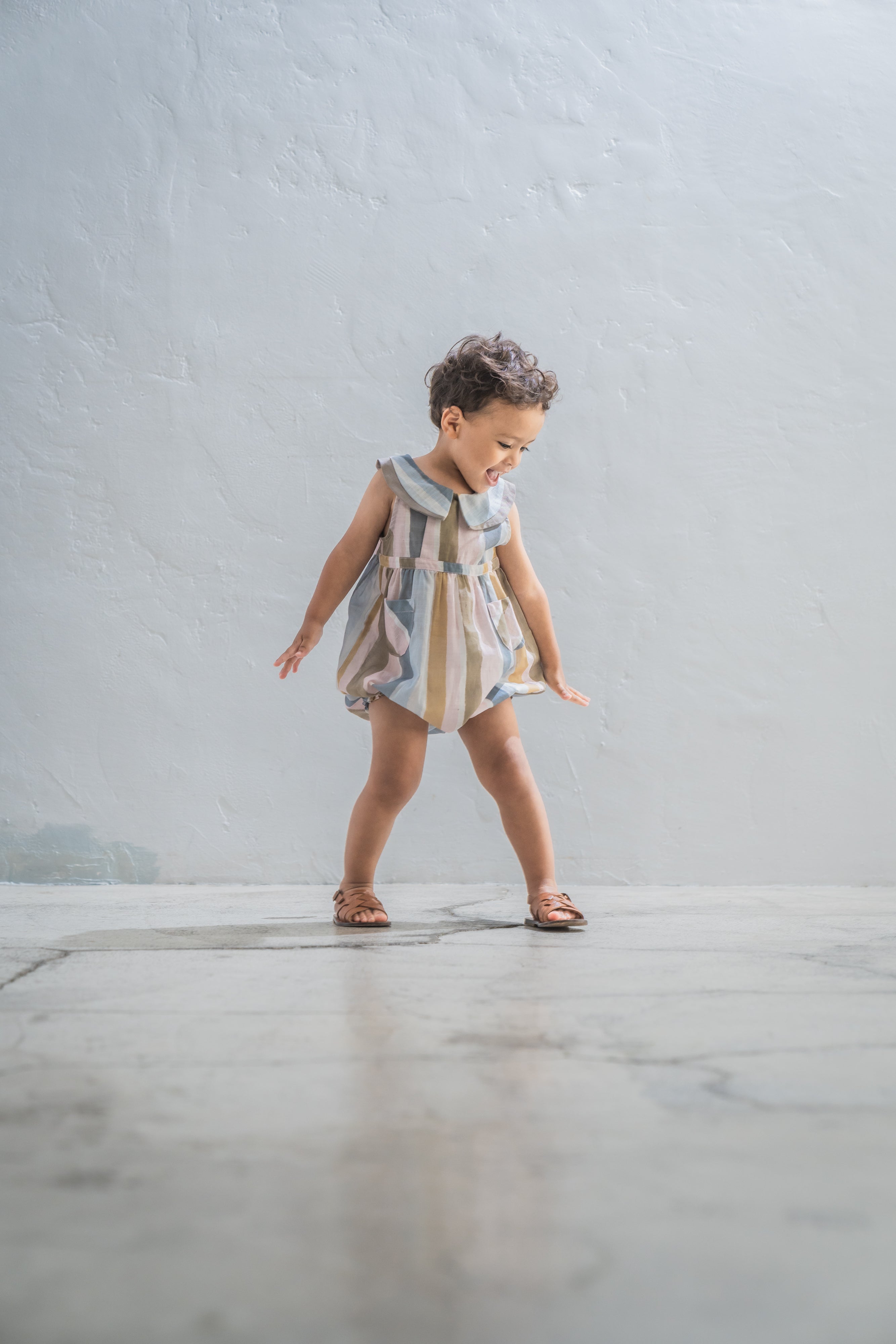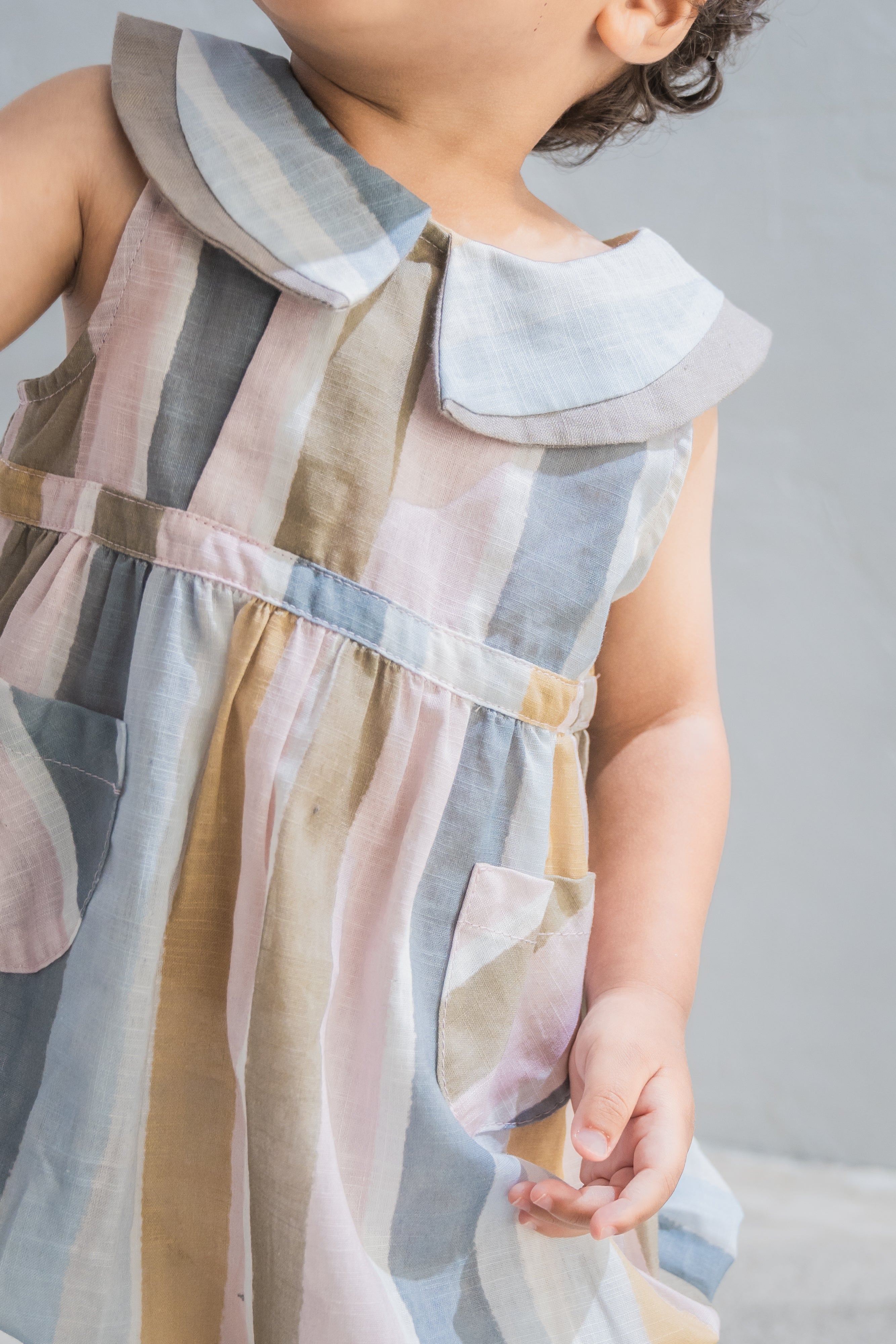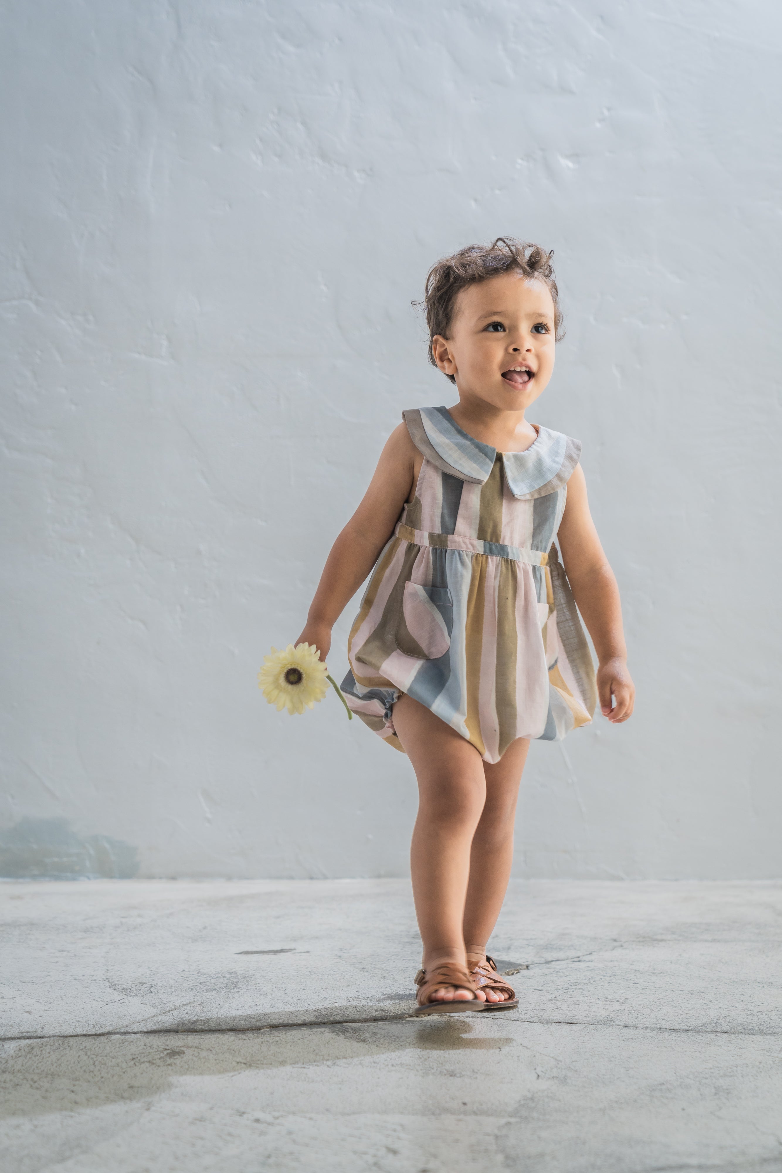 The Oliver Baby Jumpsuit is a sleeveless style with a unique curved contrast trim, inspired by our Marlo top. It features a side front button opening, snap buttons for easy nappy changes, and elasticated leg openings for comfort. Finished with two patch pockets.