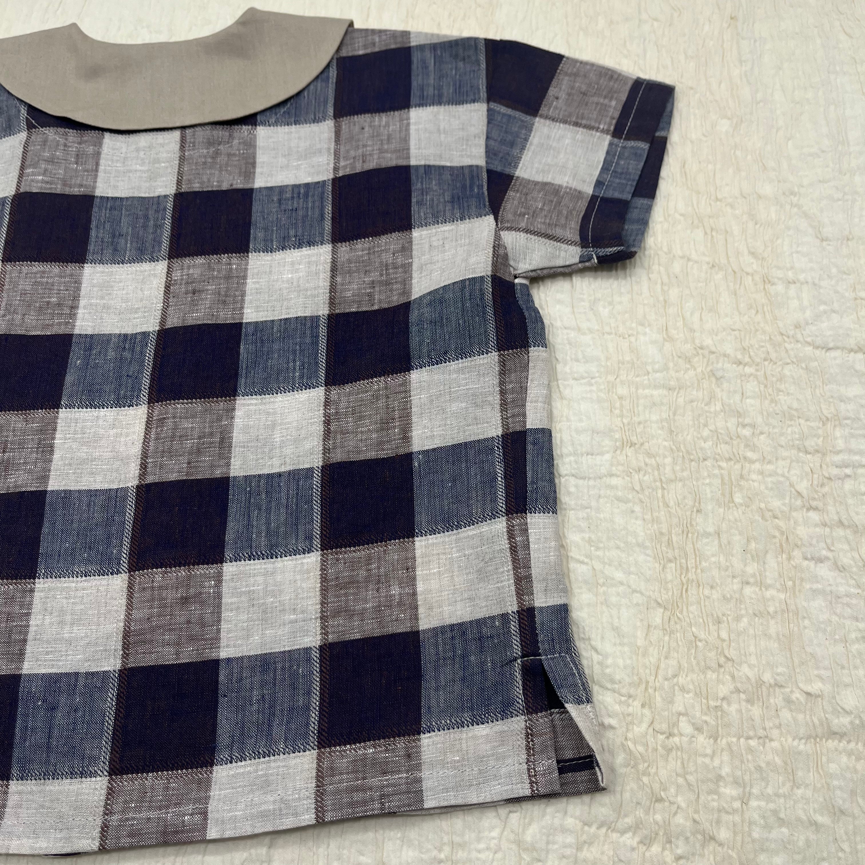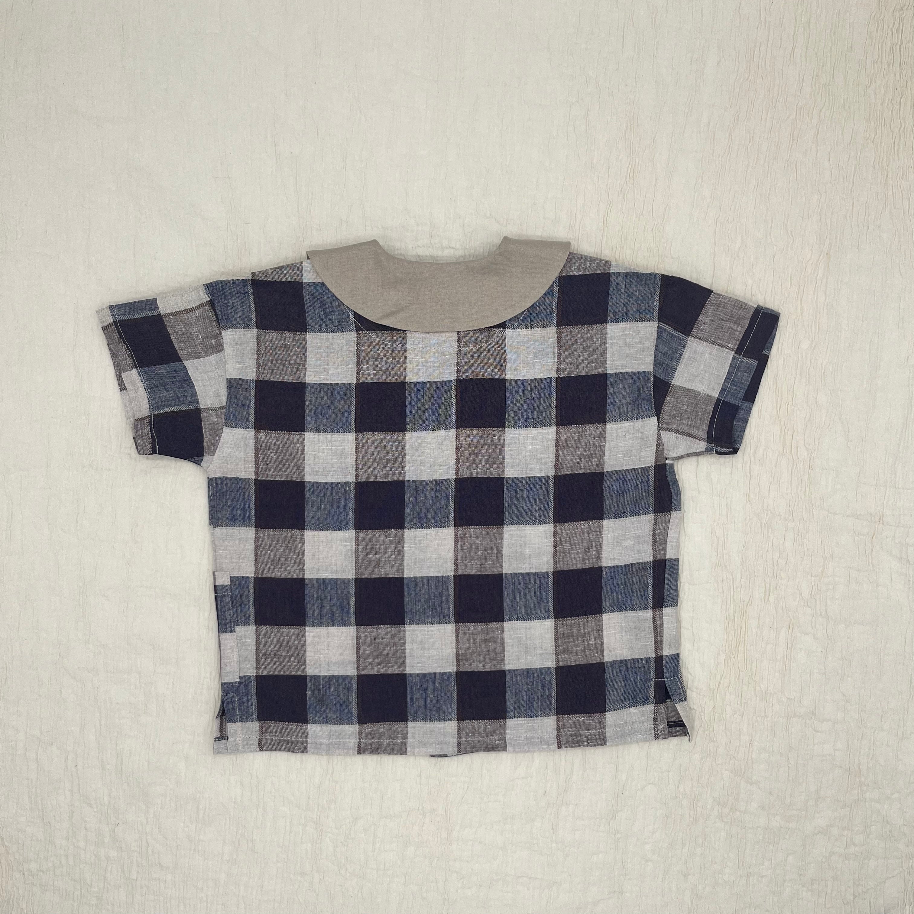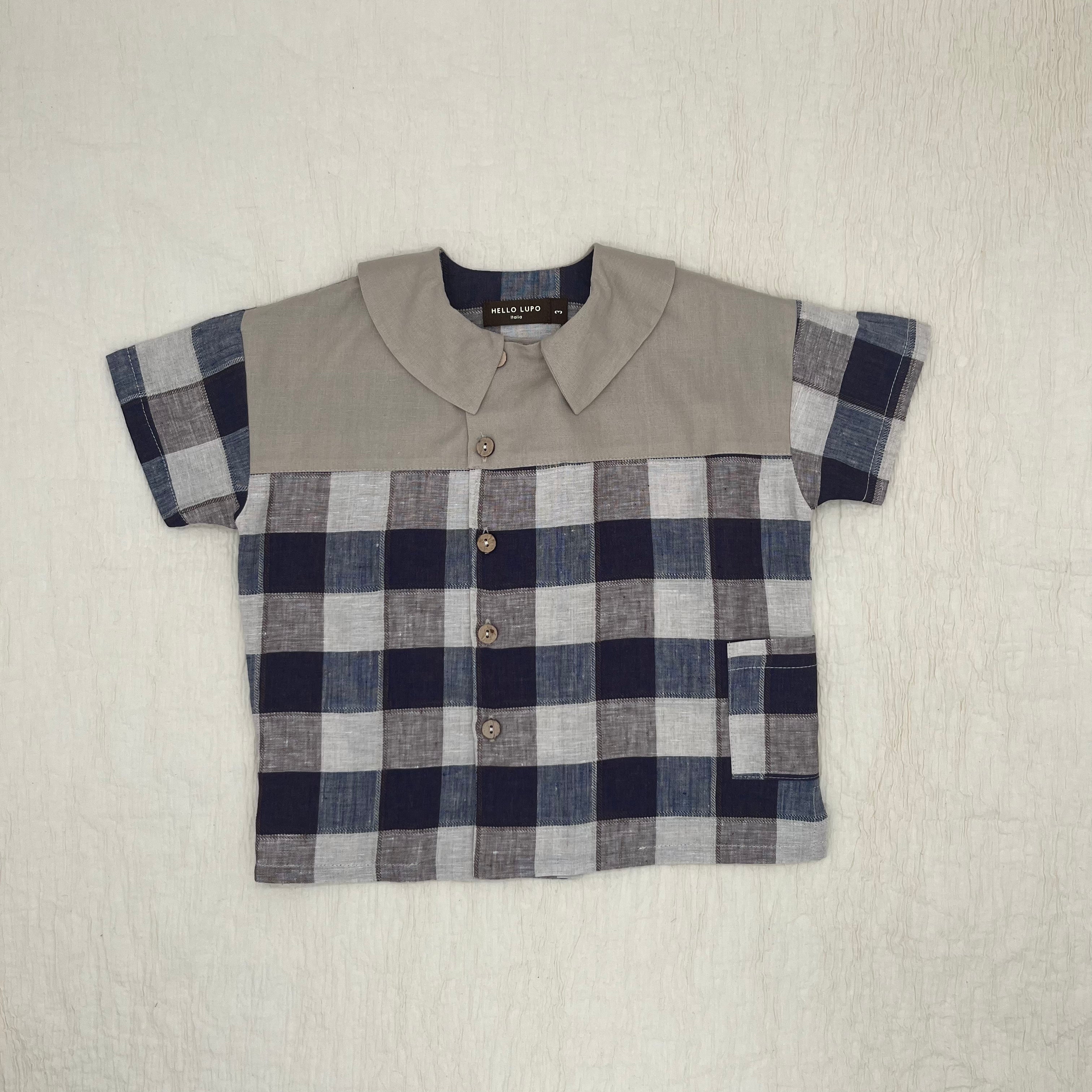 Short-sleeved shirt with a contrast panel, pointed collar, and side button fastening. Left patch pocket detail.