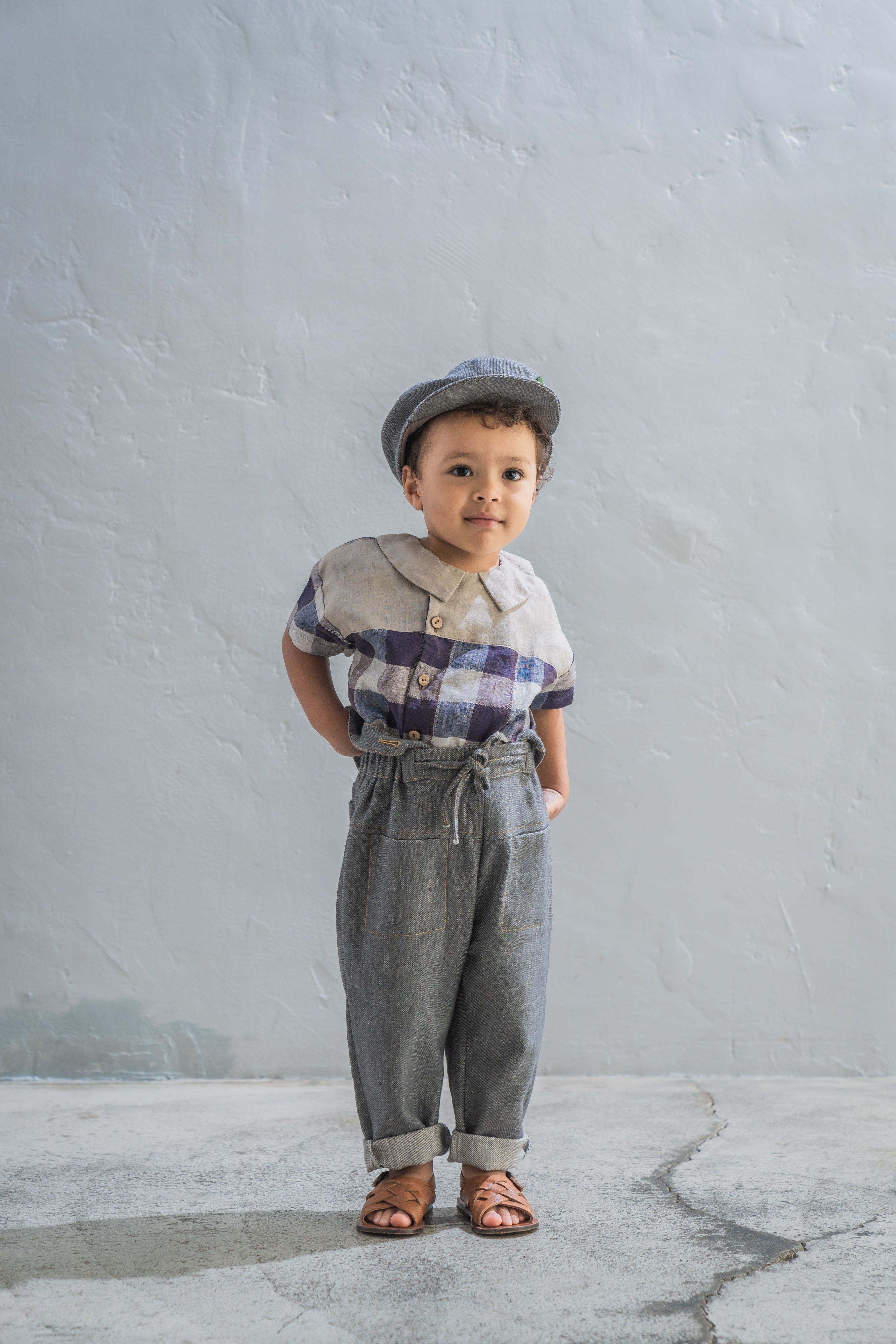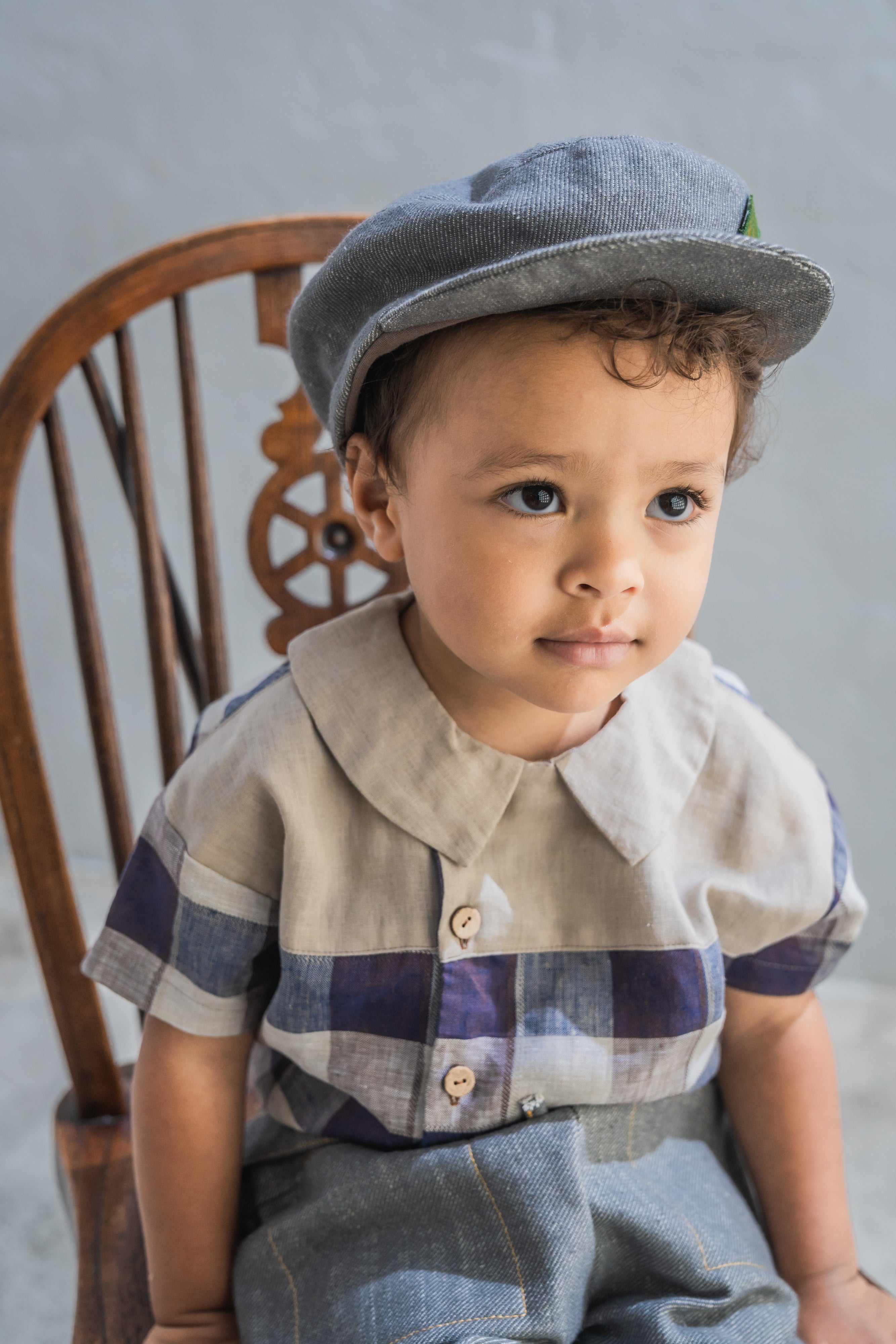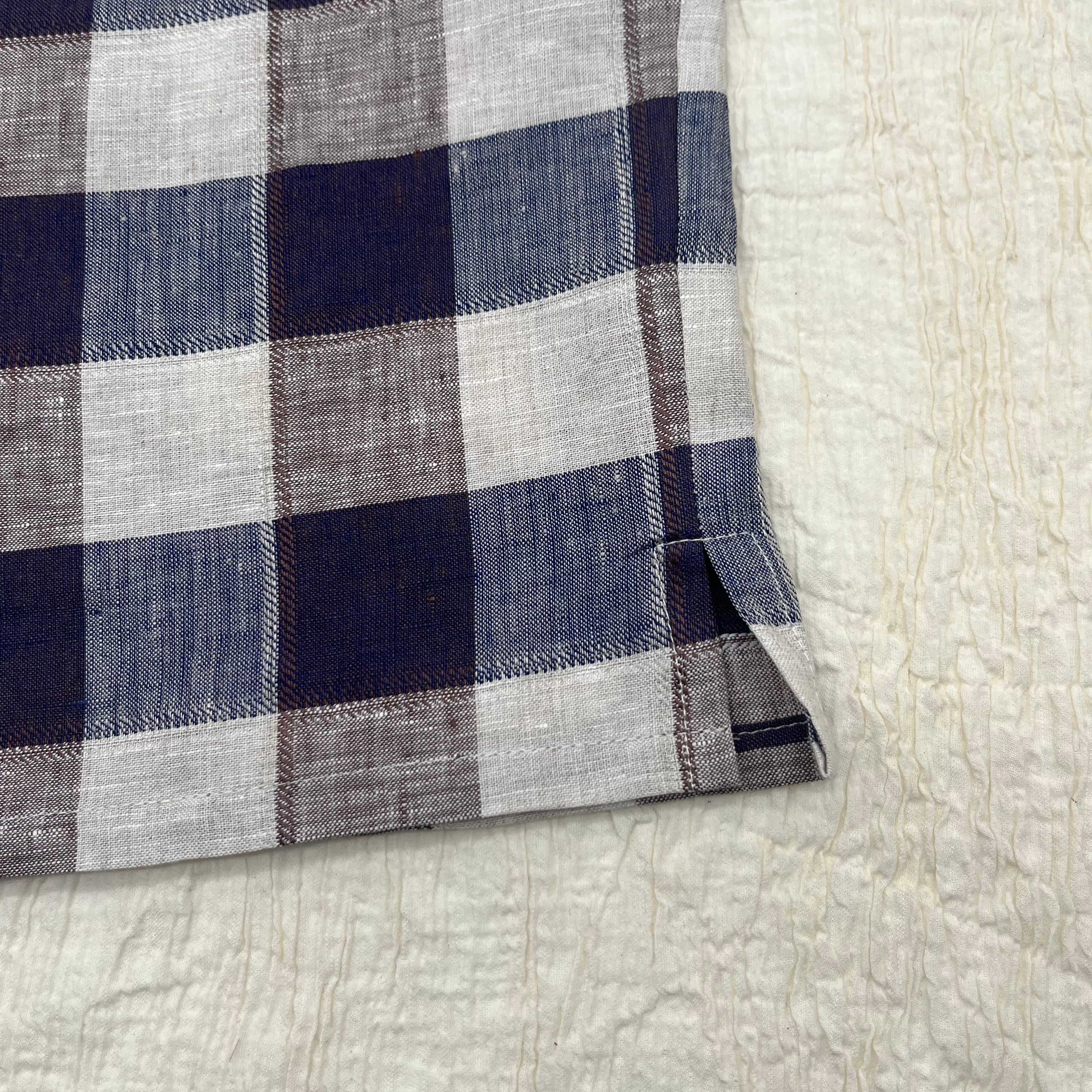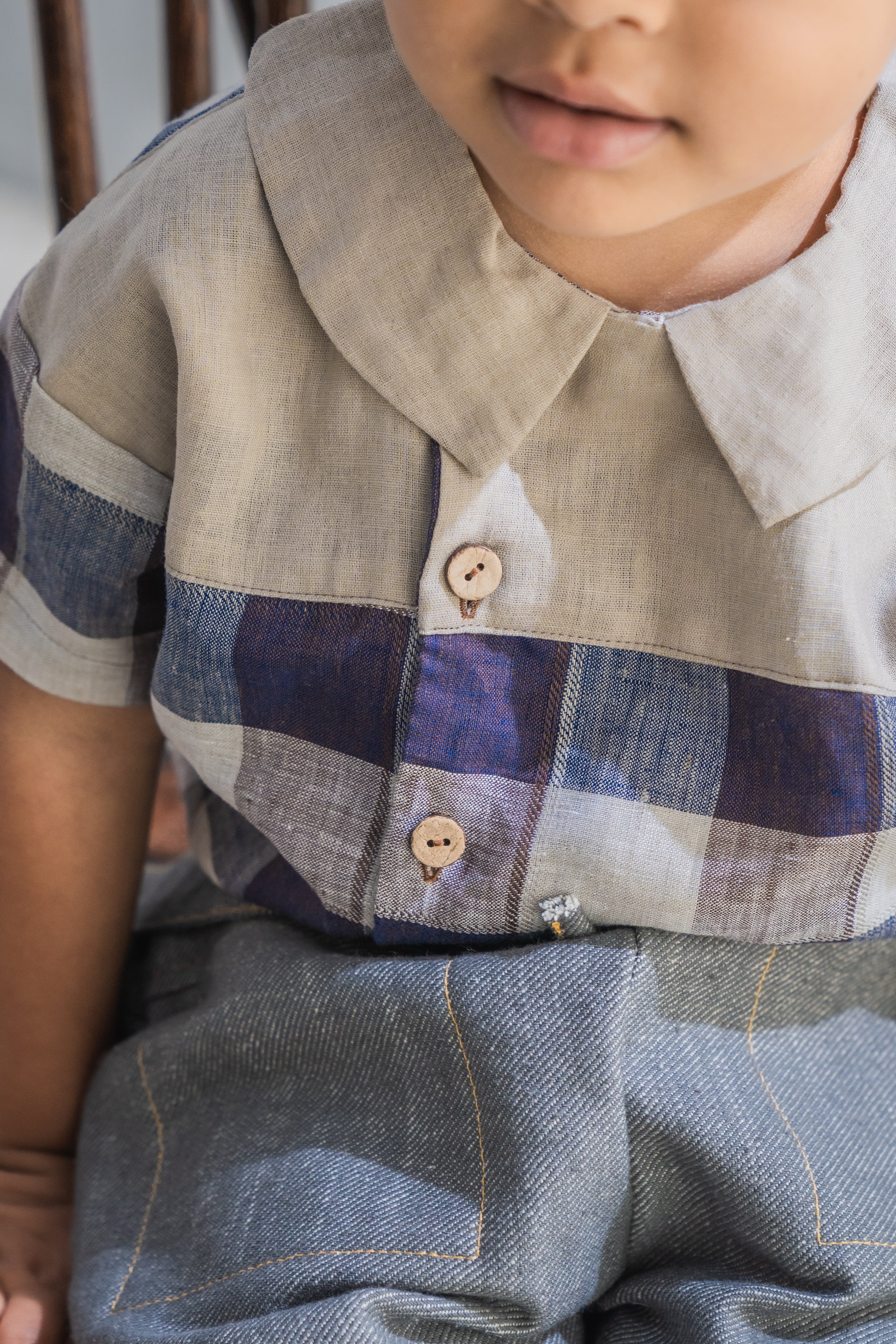 Short-sleeved shirt with a contrast panel, pointed collar, and side button fastening. Left patch pocket detail.
