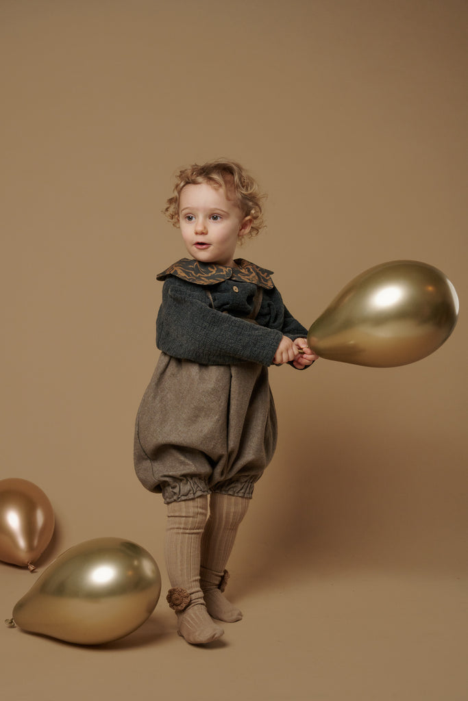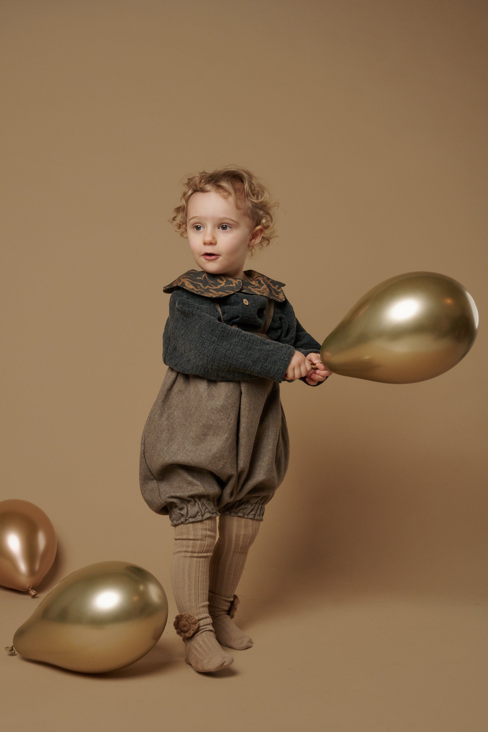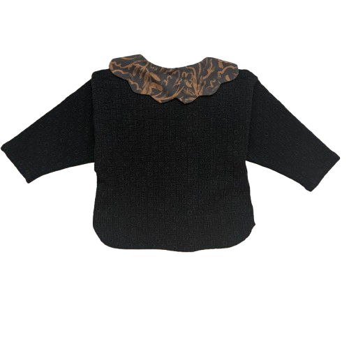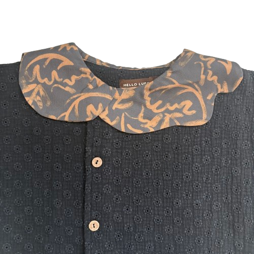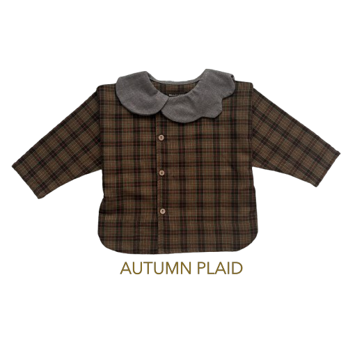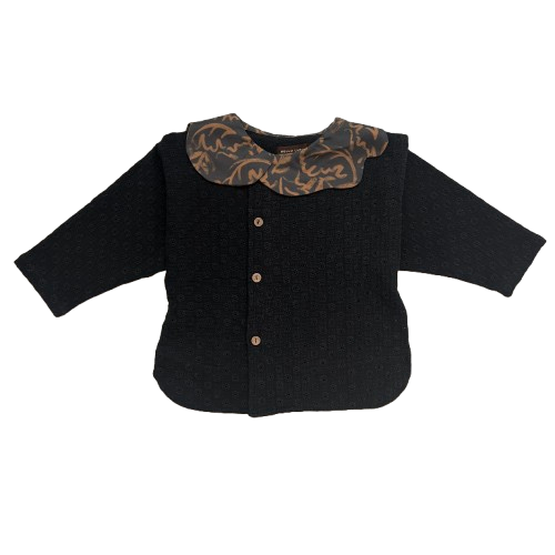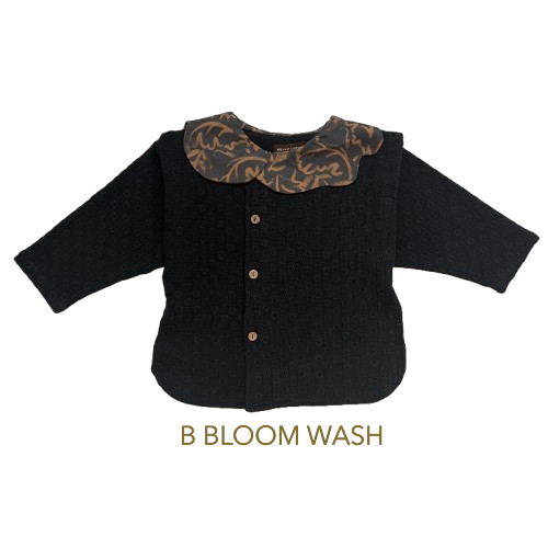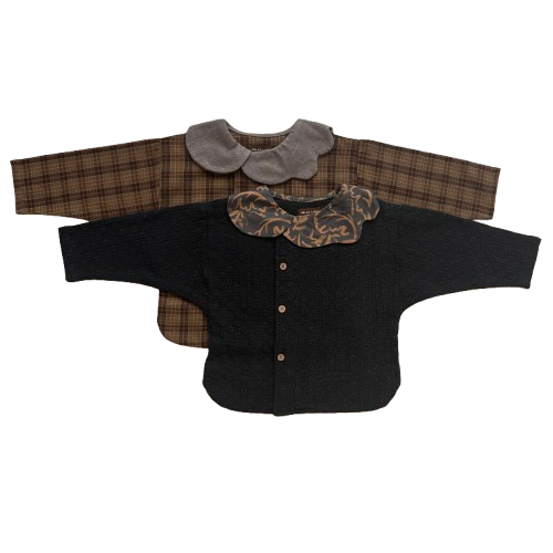 This kimono sleeved shirt features a charming cloud-shaped collar, front button closure, and side vent opening. It offers both style and comfort for your child. A beautifully crafted piece for any wardrobe.