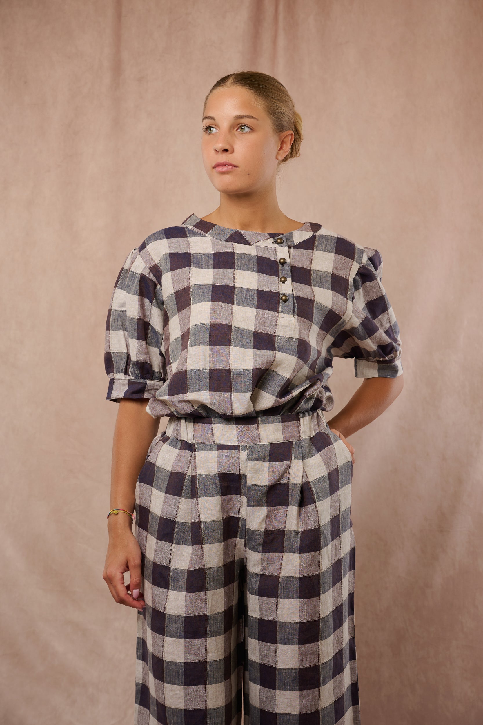 Women’s blouse with short puffed sleeves and matte gold button front opening. Comfortable and chic.