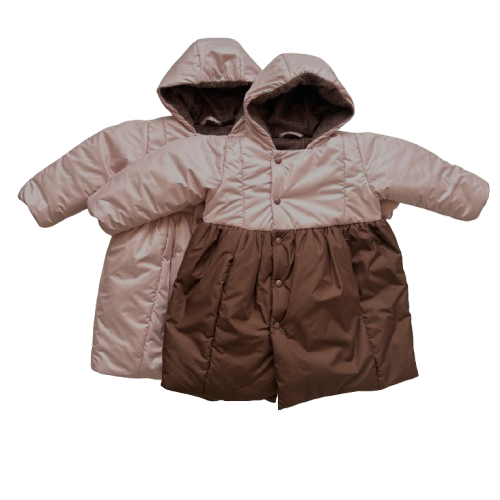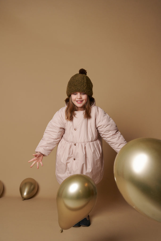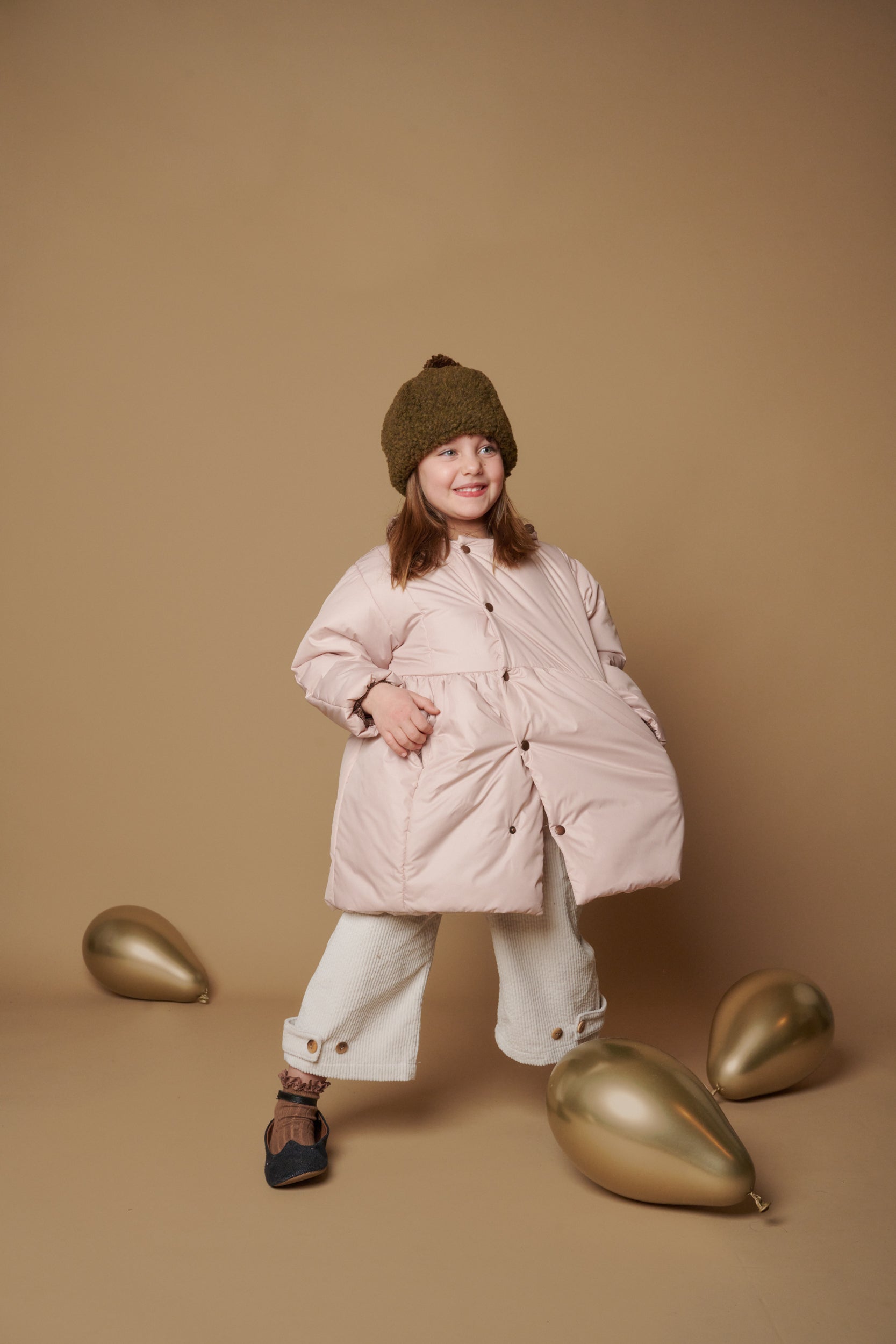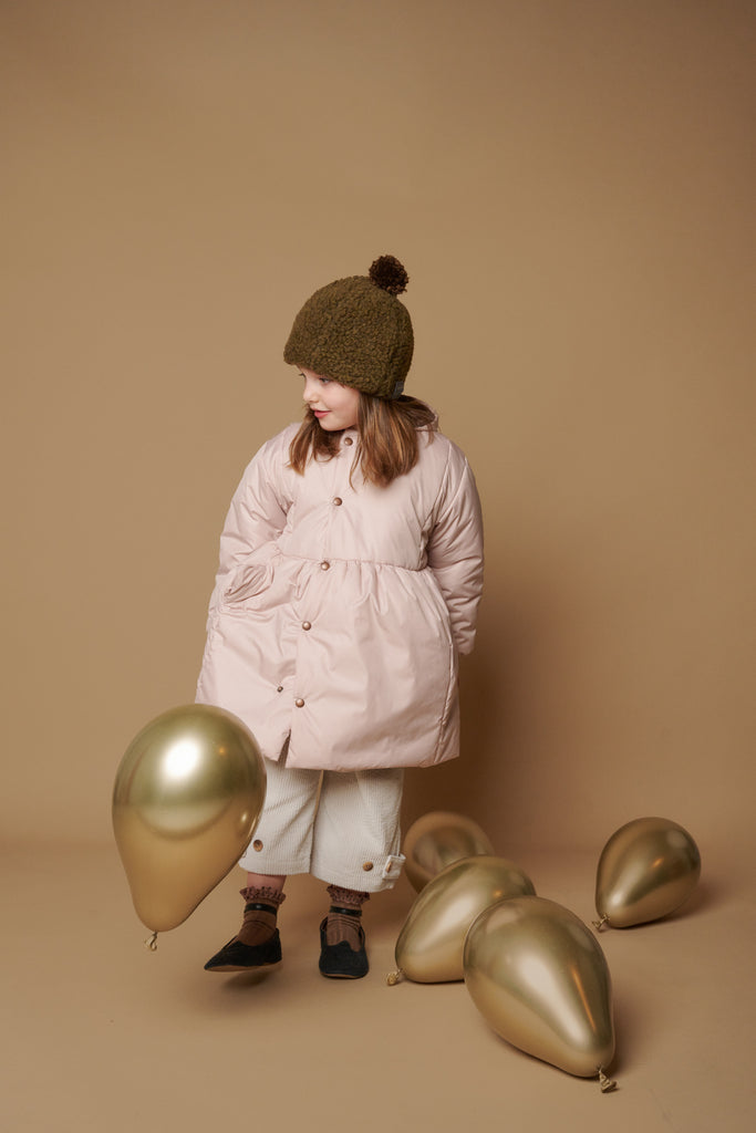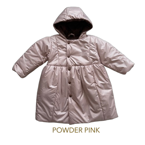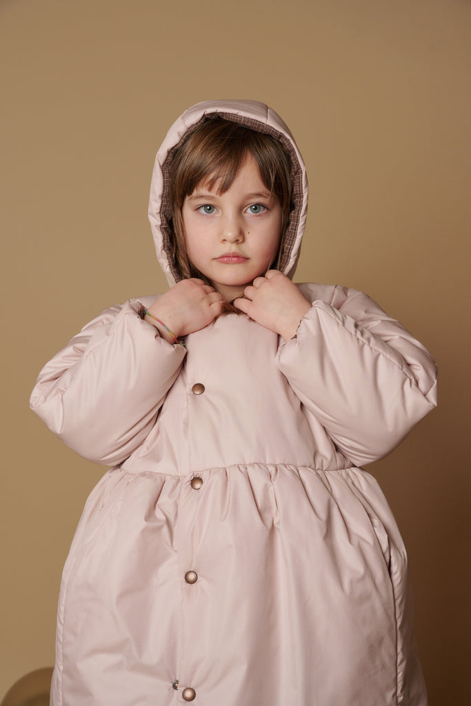 フード付きのラウンドショルダーコート。フロントボタンで留められ、パッチポケットが付いています。