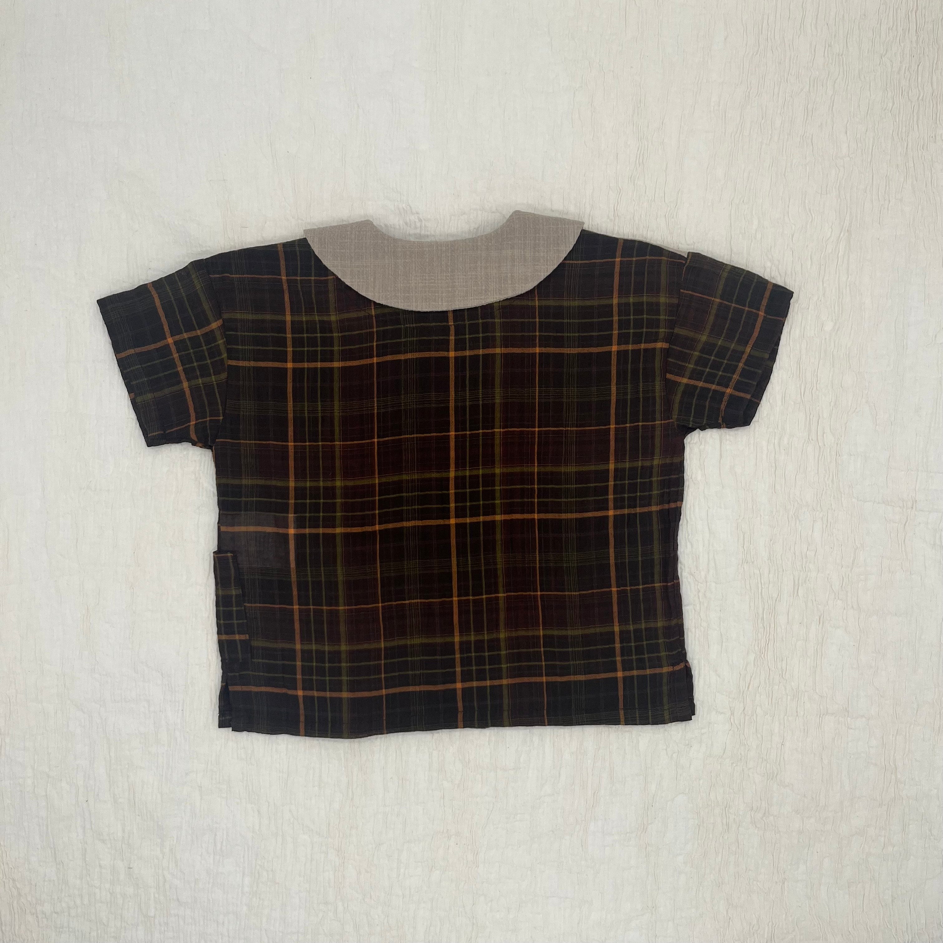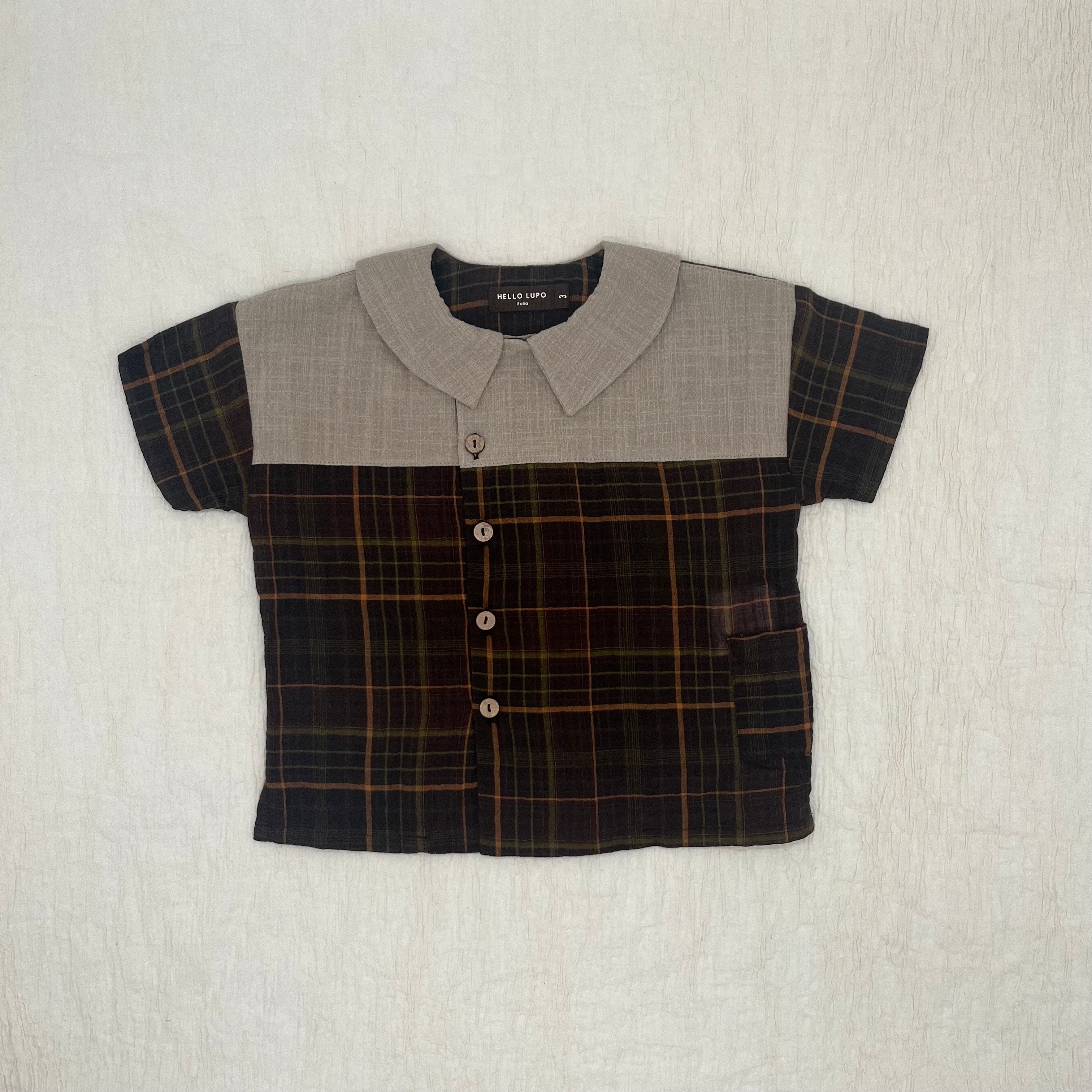 Short-sleeved shirt with a contrast panel, pointed collar, and side button fastening. Left patch pocket detail.