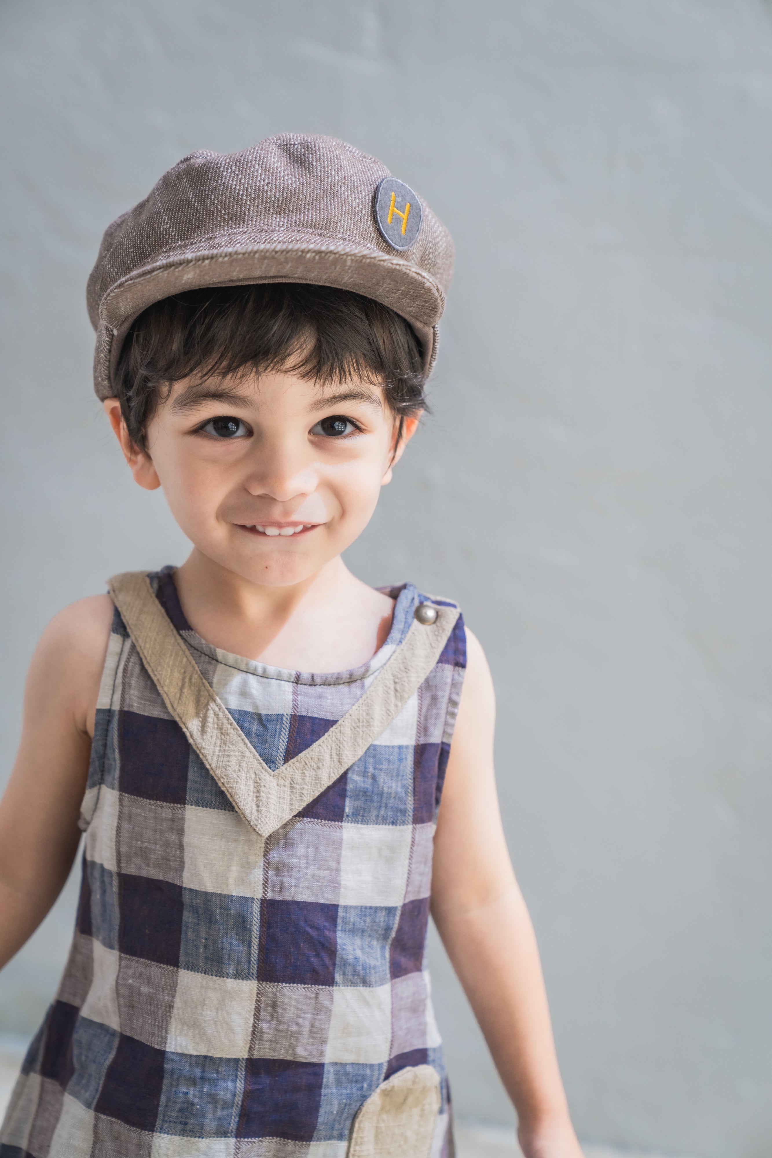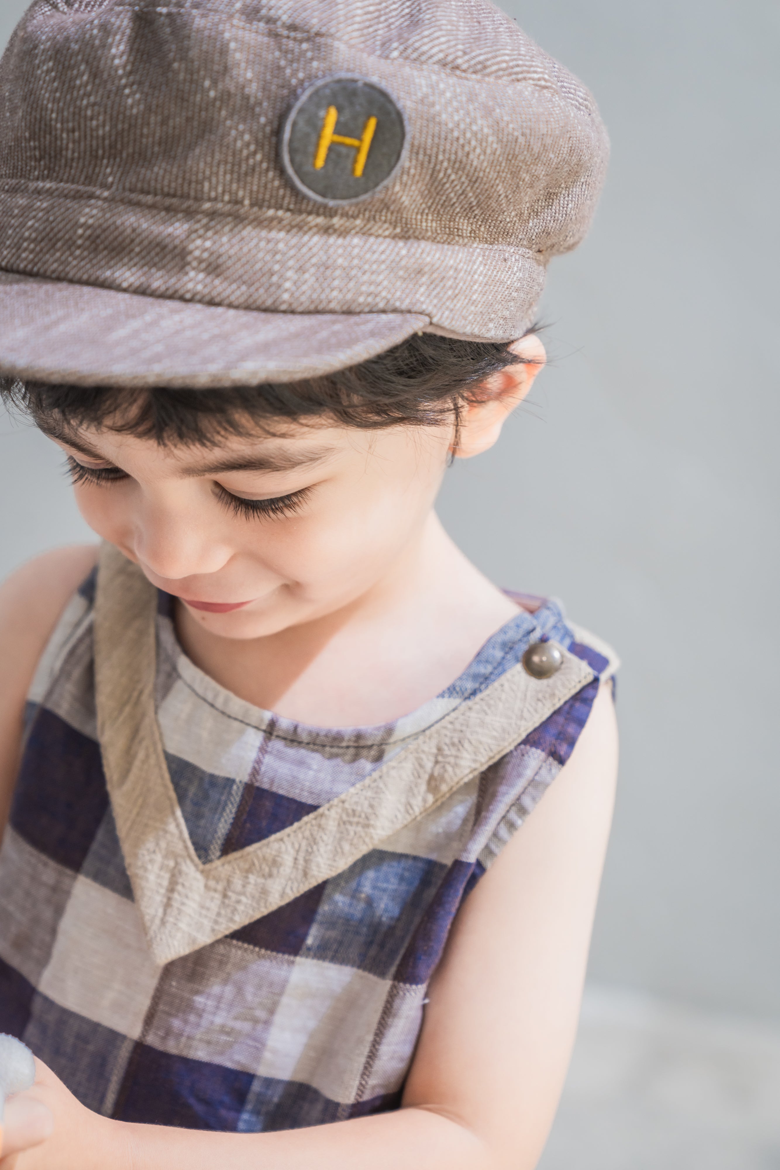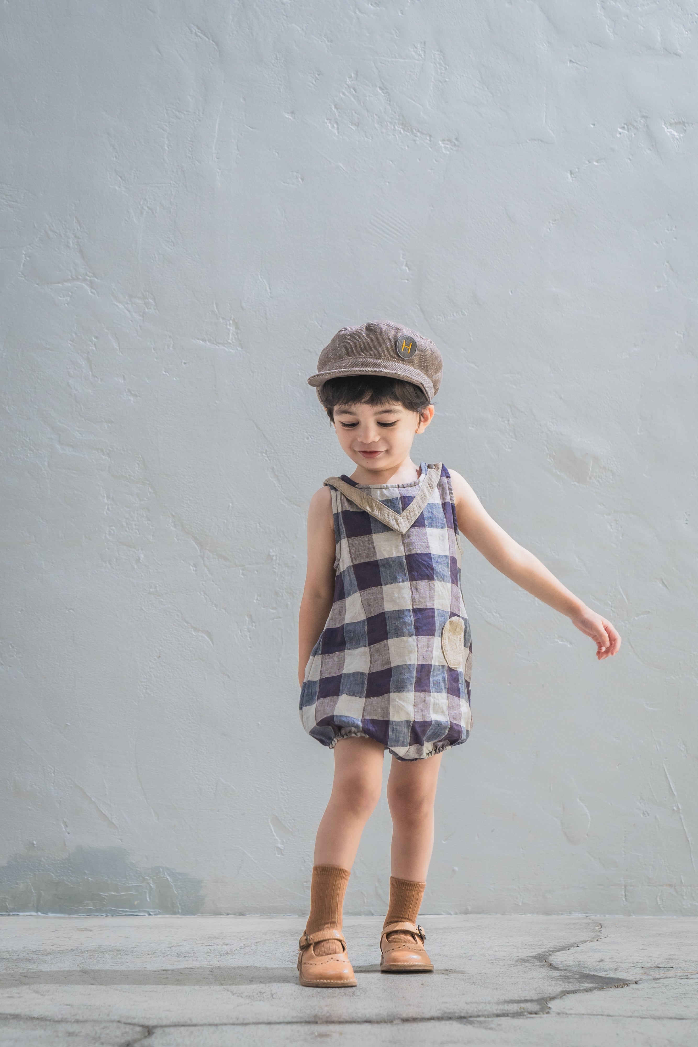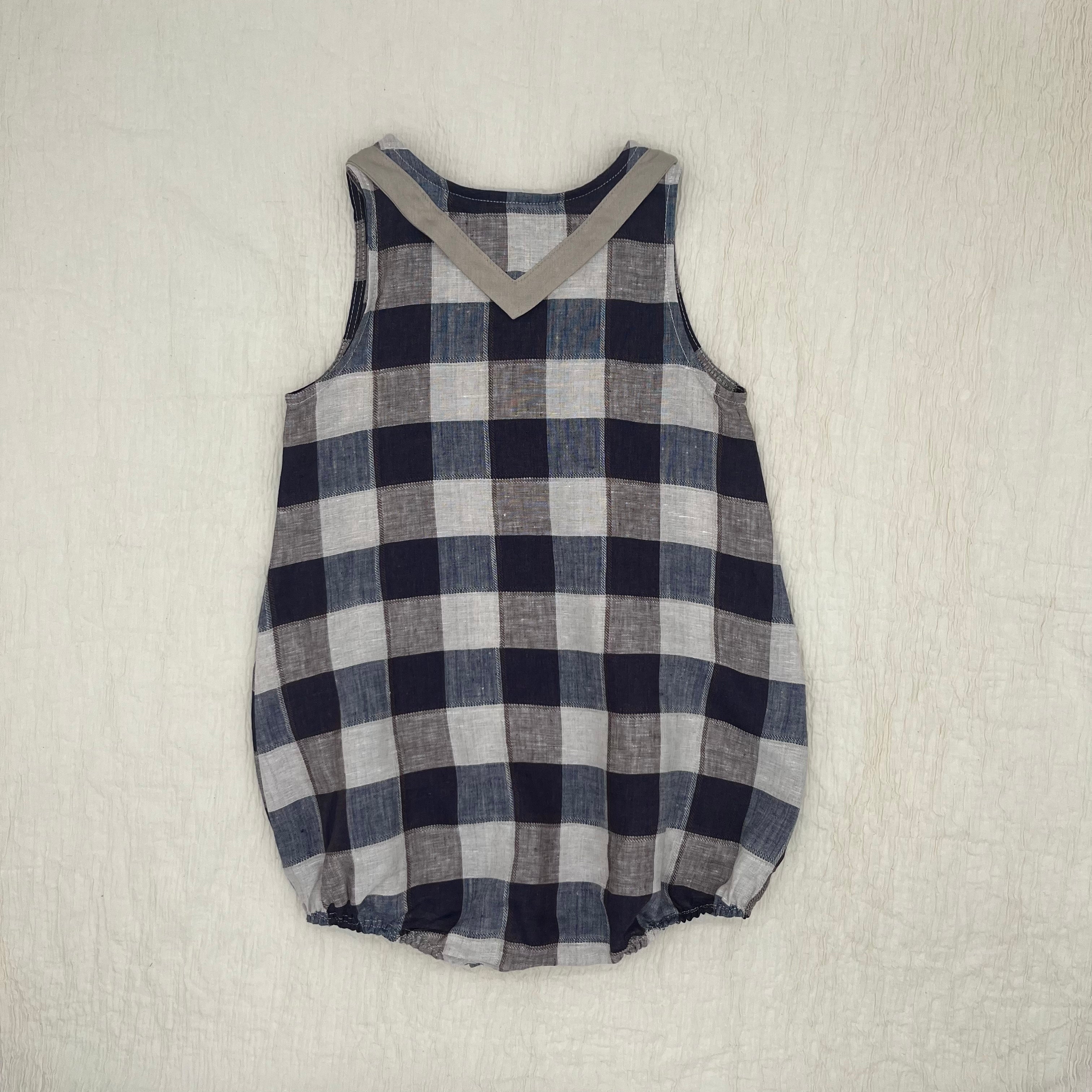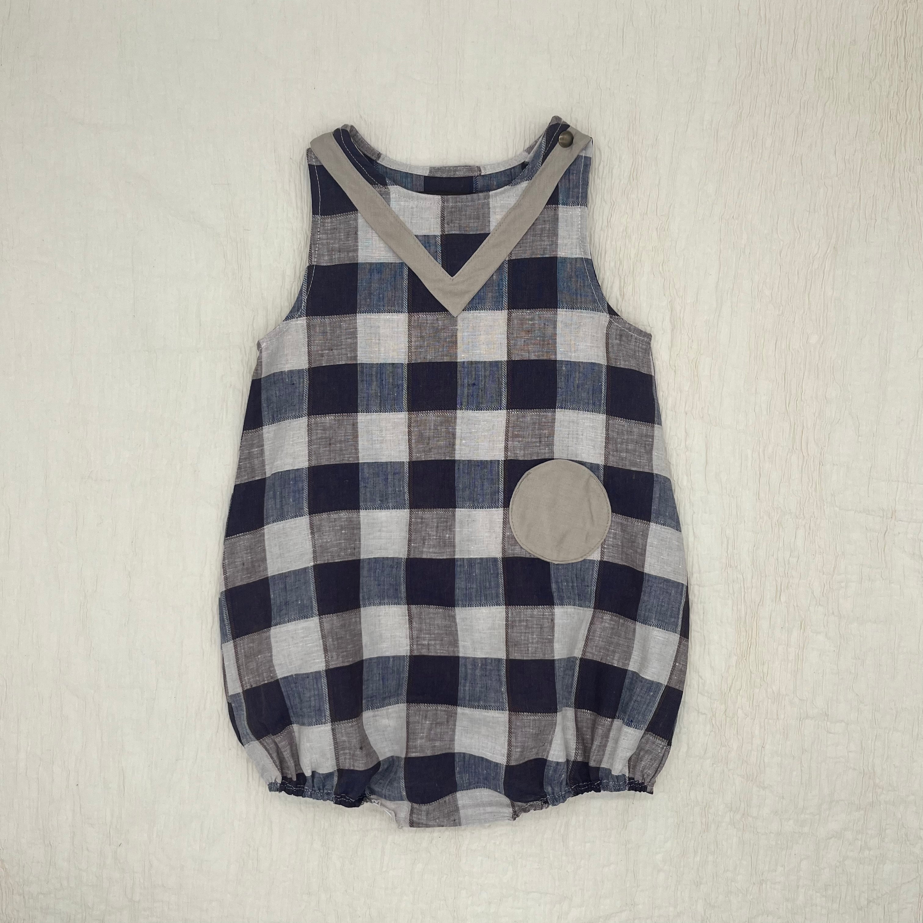 Sleeveless Ludo Baby Jumpsuit with a pointed collar and circular patch pocket detail. Features shoulder buttons and snap buttons for easy nappy changes. Elasticated leg openings for added comfort.