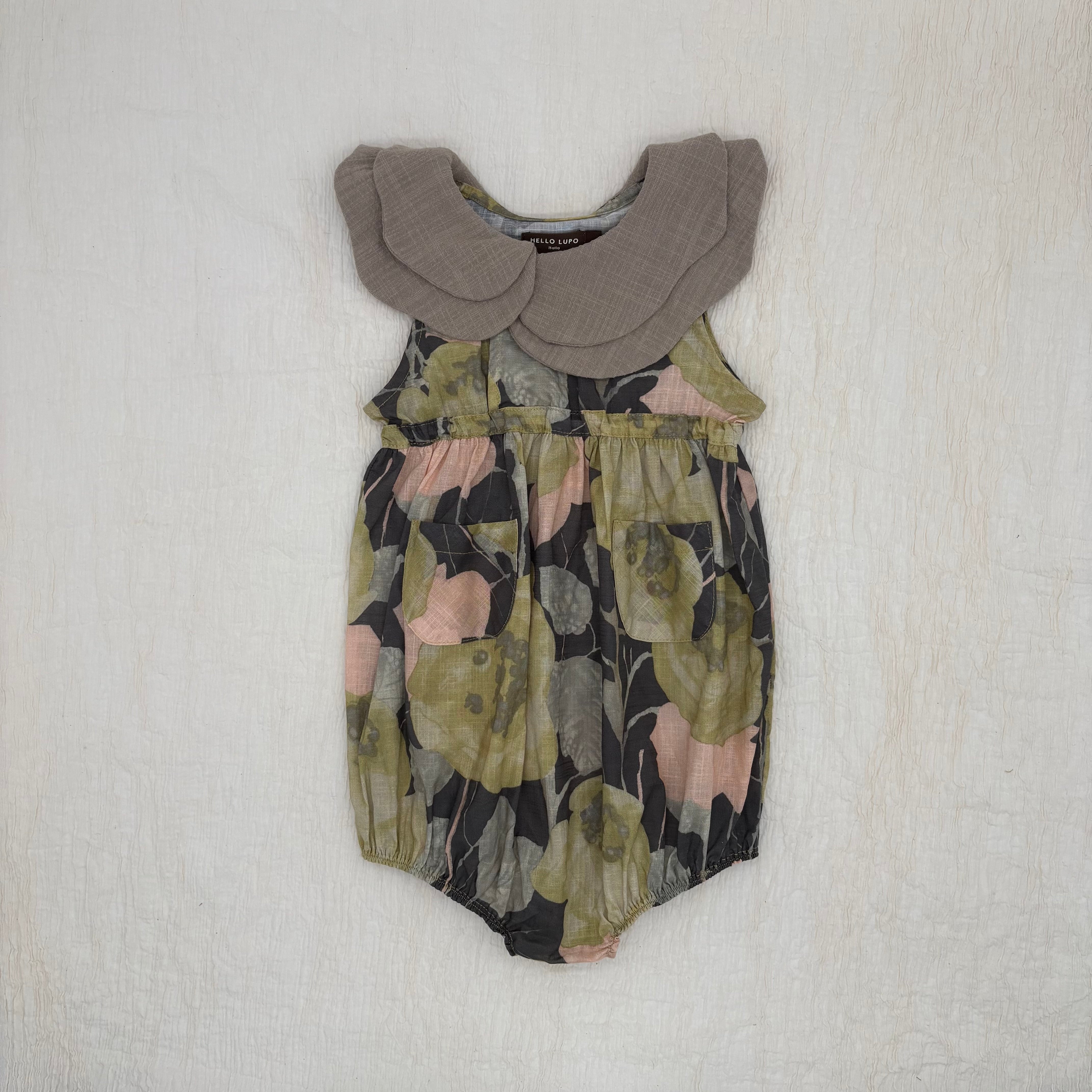 The Nami Sleeveless Baby Jumpsuit is one of Lupo’s signature pieces, defined by its distinctive double-layered collar. It features front wooden buttons, elasticated waist and legs, and two patch pockets.