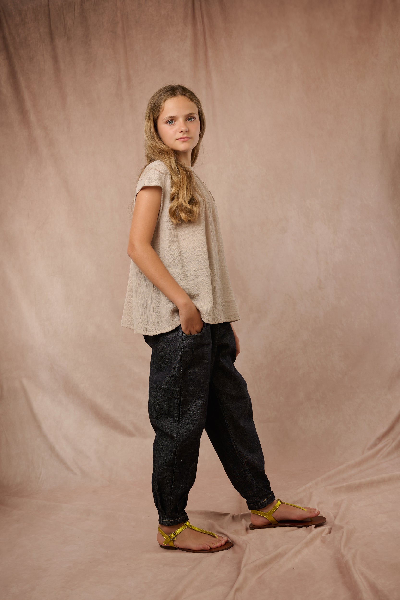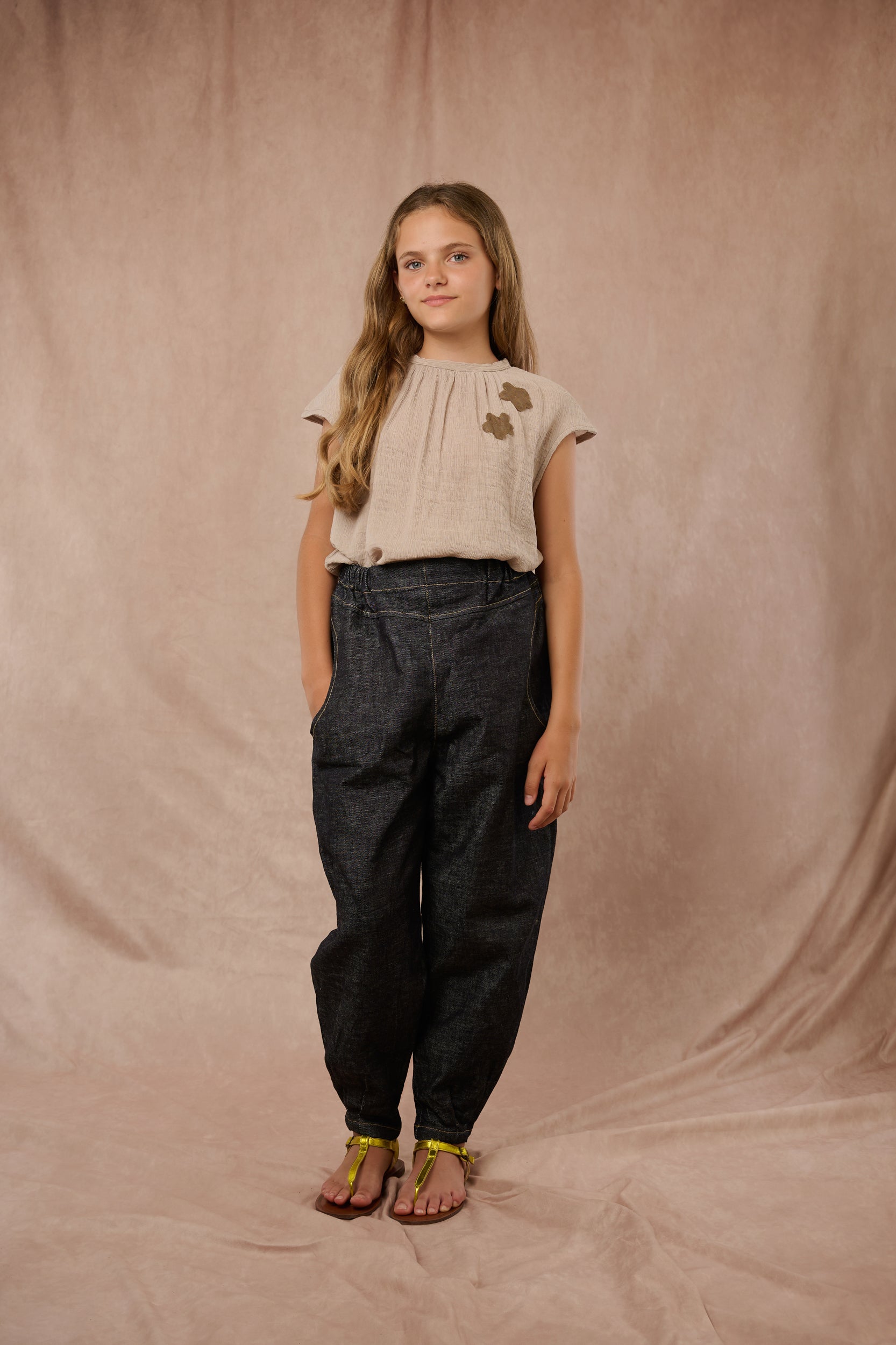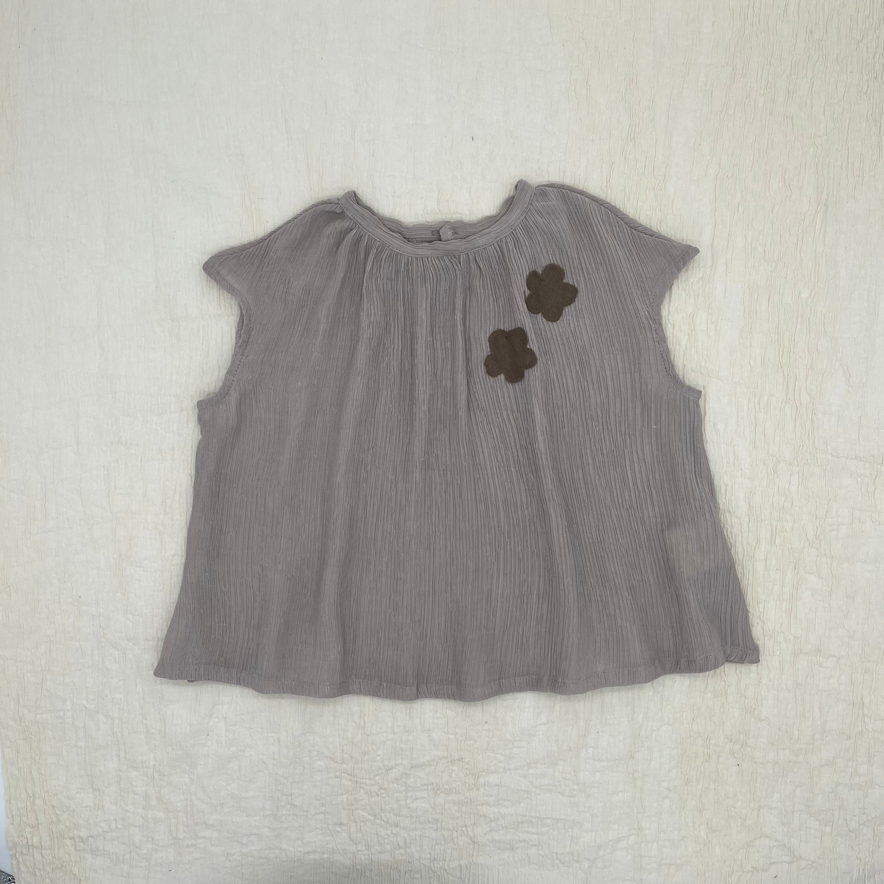 The Flora Top is a summer piece with uniquely cut sleeves and floral patches at the front. Finished with a back button closure.